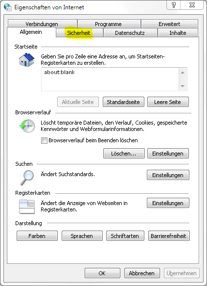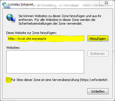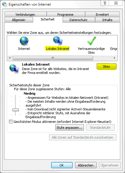 Danach wählt man den Menüpunkt für Lokales Intranet und ruft die Option für die Sites auf.