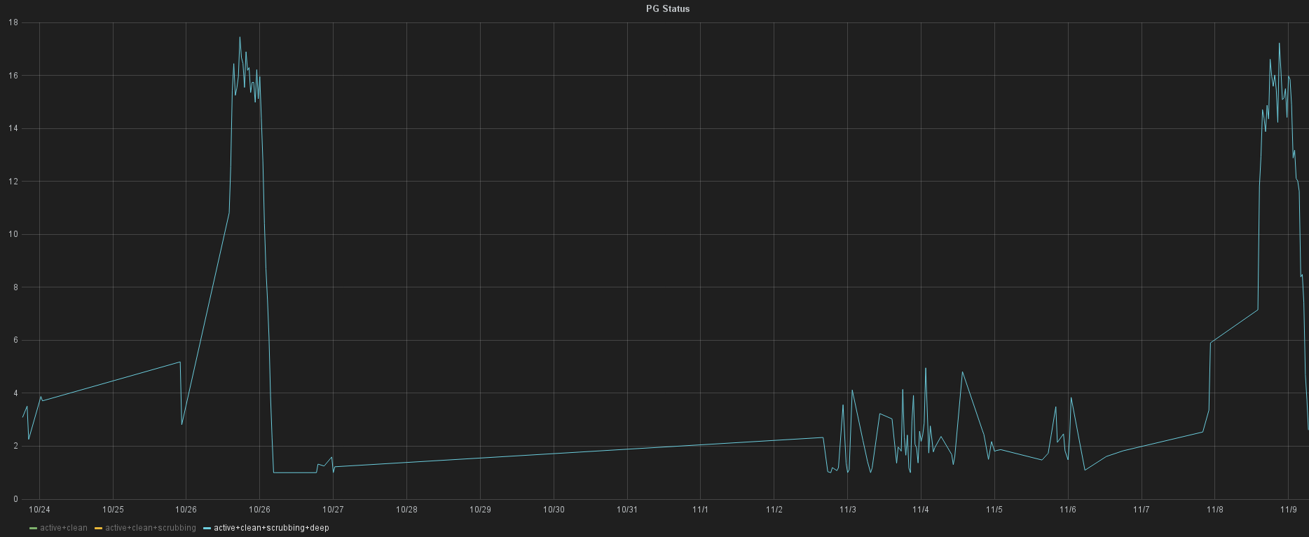Laut Mailingliste und IRC-Logs werden Deep-Scrubs immer und ausschließlich von normalen Scrubs angestoßen, und zwar dann wenn der letzte (normale) Scrub schon länger als eine Woche vergangen ist. Hat das Storage eine Load größer von 0.5 (was im Normalbetrieb immer der Fall ist), dann ist der Parameter osd scrub min interval sinnlos und es wird nach einer Woche ein normaler Scrub durchgeführt. Diese Kombination kann dazu führen, dass Deep-Scrubs erst nach osd scrub max interval + osd deep scrub interval durchgeführt werden. Im Standard Fall somit erst nach zwei Wochen. Je nach Startzeitpunkt der Intervalle werden alle Scrubs hintereinander durchgeführt was somit alle zwei Wochen im gleichen Zeitraum Last verursacht. Im Graphite und Grafana kann man solch ein Verhalten natürlich leicht erkennen 🙂