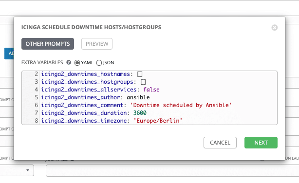 The following code is the usage of icinga2_downtimes module which can create downtimes for hosts or hostgroups but the parameters cannot be used at the same time. In this case I can show the variable for hostnames and hostgroups in the webinterface. The user will use one variable and the other variable will be removed and therefore no errors occur.