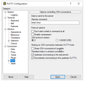 Öffnet man Putty, sieht man die Session mit der Liste von Hosts und Links in der Sidebar verschiedene Dropdown-Punkte unter anderem den Punkt SSH, diesen wenn man anwählt kann man einige Einstellung vornehmen unter anderen „Remote command“ und hier trägt man „exec tmux“ ein und speichert das beim Host ab und schwups hat mein beim nächsten SSH-Login eine Tmux-Session parat, Klasse. Dann viel Spaß beim ausprobieren.