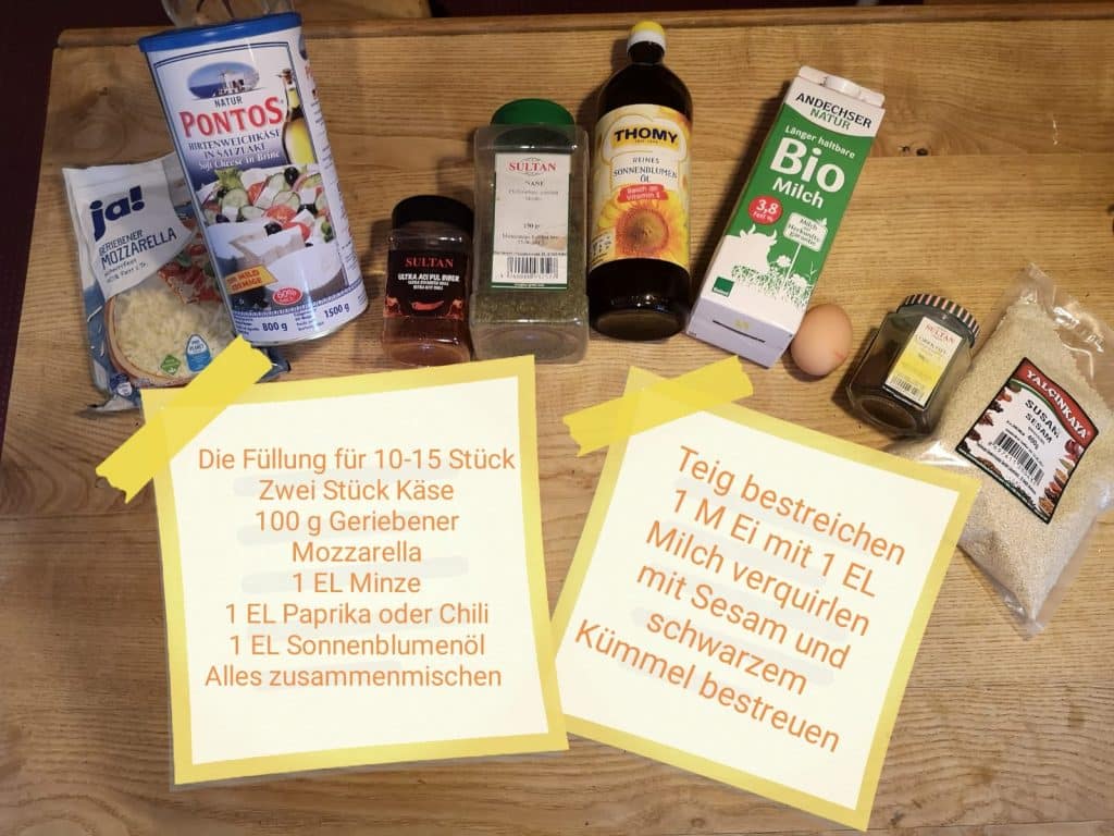 Der Teig kann mit Käse, Hackfleisch, Spinat, Thymianblätter, Tomaten und Paprika oder Wurst usw. befüllt werden. Hier setzt nur die Kreativität die Grenzen!“
