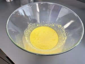 Parallel dazu die Eier in eine große Schüssel geben und entweder das Eigelb mit dem Eiweiß vollständig hinzufügen oder das Eigelb vom Eiweiß trennen und nur das reine Eigelb verwenden (bevorzugt). Mit einem Schneebesen die Eier in der Schüssel zu einer gelben Masse verarbeiten und 4 Esslöffel des Nudelwassers hinzugeben. Den Parmesan hinzugeben, verrühren und mit Salz und Pfeffer abschmecken.