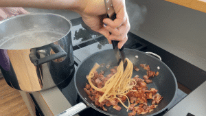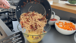 Wenn die Nudeln fertig sind, diese direkt aus dem Kochtopf mit einer Nudelkelle in die heiße Pfanne mit dem Schinken geben und zusammen vermengen. Zum Schluss den Inhalt der Pfanne in die Schüssel mit der Eimasse geben und alles vermengen.