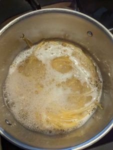 – Wenn die Nudeln fertig sind, auch diese in die Pfanne hinzufügen und ein Schuss vom Nudelwasser mit dazu tun.