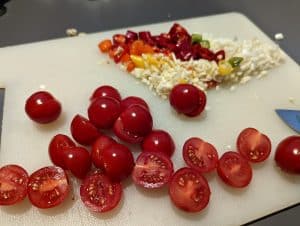 – Knoblauch und Chili klein schneiden und in eine Pfanne mit Olivenöl auf hoher Hitze für 5 Minuten anbraten. Danach die Tomaten halbieren und hinzufügen.