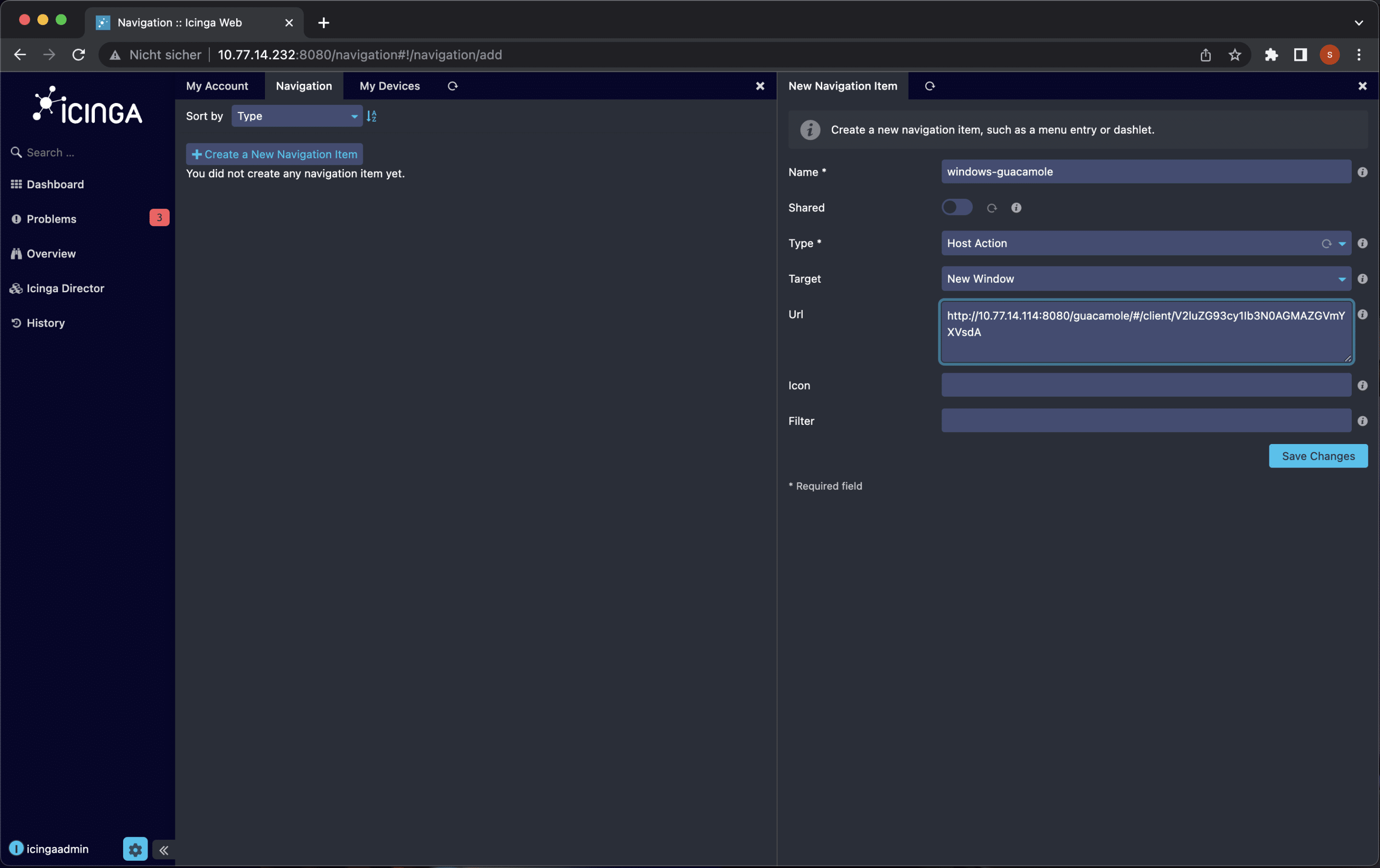 Nachdem Icinga Web 2 installiert wurde, loggen wir uns in Icinga Web 2 ein. Für den Eintrag der Guacamole-URLs wird die Shared Navigation Option unter den icingaadmin-Enstellungen genutzt. Hier wird ein Name für die Navigation eingegeben, als Type kann man Service oder Host Actions auswählen (und so konfigurieren, wo die Navigation angezeigt werden soll). Ins Target Feld kann die Darstellungsart des Remote-Fensters gesetzt werden und in der Url wird die Guacamole-URL der Remote-Systeme eingetragen, die wir im Guacamole-Webinterface haben.