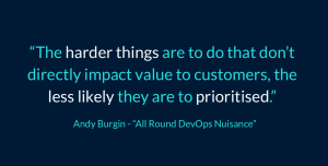 While some people felt the problem was the Ops team. Here, NoOps was a thing. This misconception came from thinking that the Ops team didn’t care about users because the Ops team didn’t want to release the new features fast enough. As a result, more and more typical Ops tasks like backup, monitoring or cost management were outsourced to developers. At a certain point, these additional tasks became too much for the dev team, which some developers were also unhappy with.