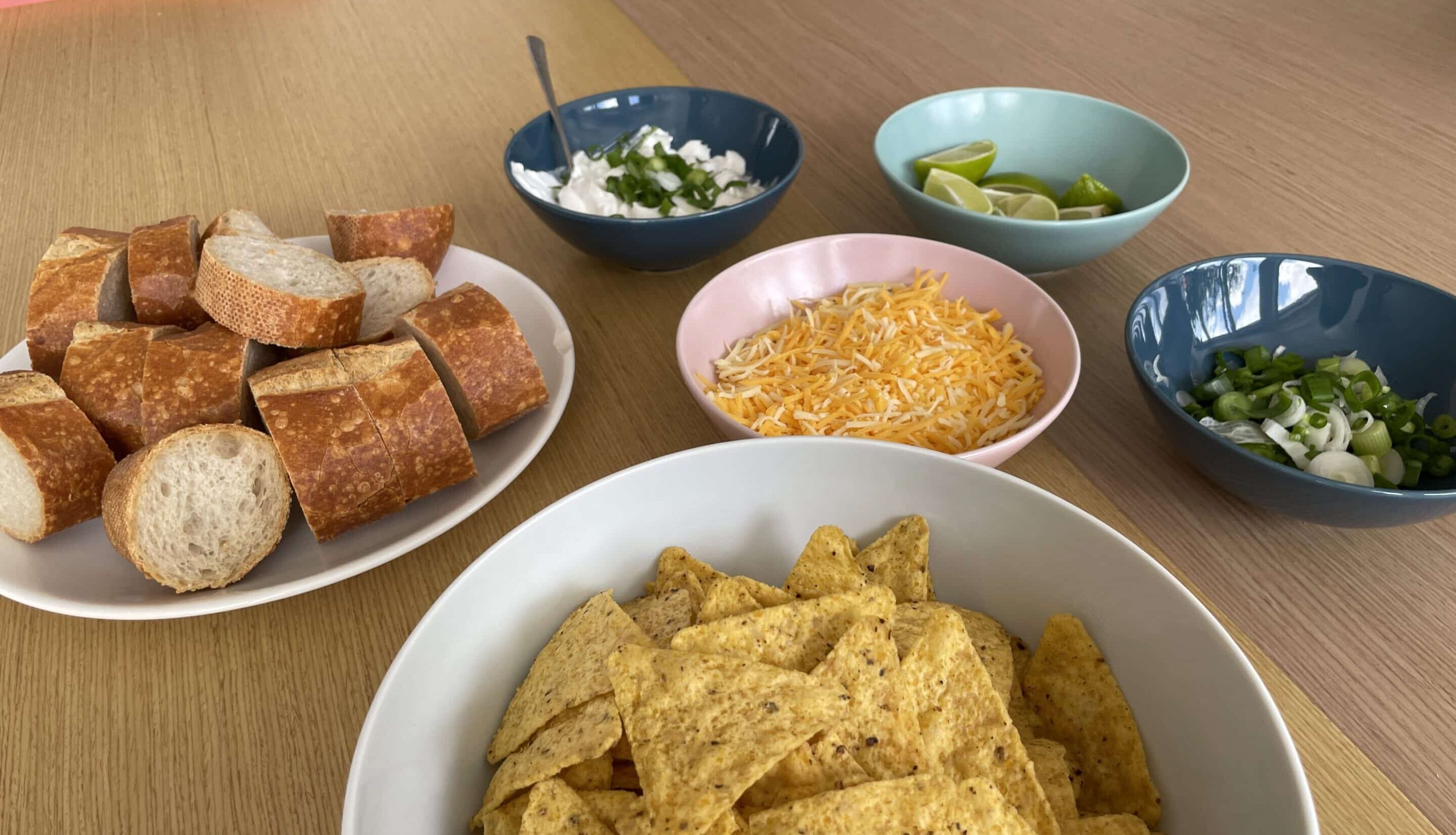 Während das Chili köchelt, können die Beilagen vorbereitet werden. Für die Crème Fraîche rührst du Frühlingszwiebeln unter, die zuvor gewaschen und in feine Streifen geschnitten wurden. Das Baguette wird zugeschnitten, und Tortilla-Chips sowie Käse werden jeweils in Schüsseln drapiert und angerichtet.