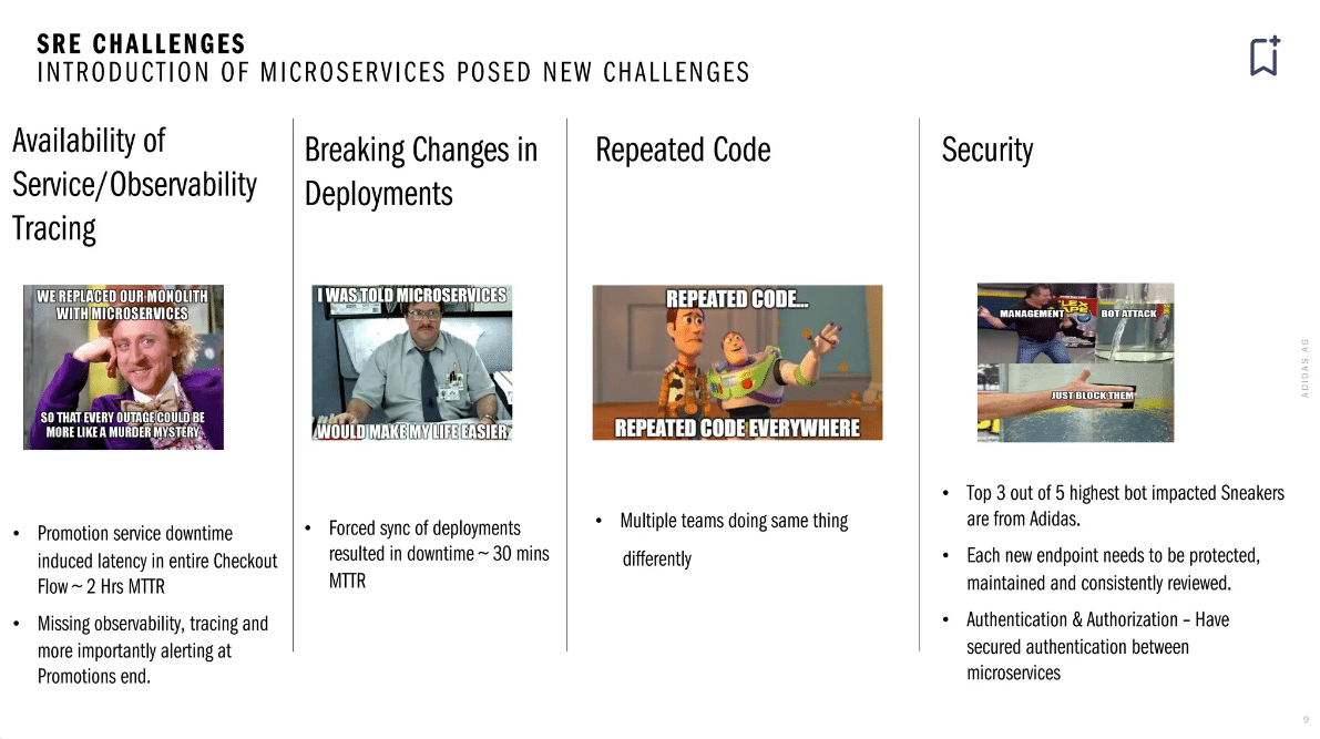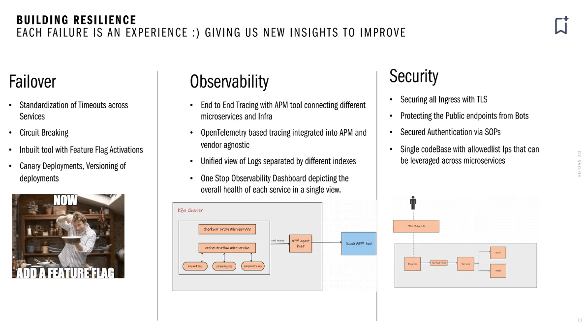 To face these challenges adidas came up with the following solutions (among others): To be able to spot breaking changes that will lead to downtimes early on and reduce their impact, the strategy of canary deployments is used. For Observability purposes End-to-End Tracing with APM tools was introduced. Also, several security measures were taken to protect the public API endpoints from bots that flood their online shop.