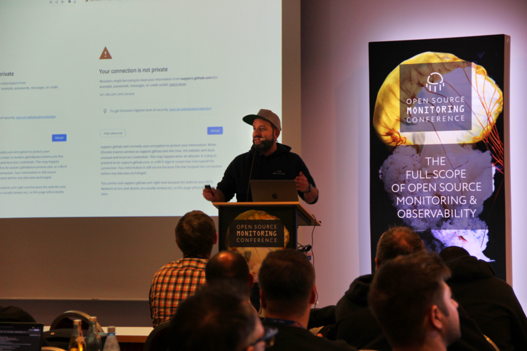 The next talk, Andreas Lehr from We Manage introduced various tools for monitoring web applications from the customer’s perspective. He emphasized the importance of shifting the focus from internal metrics to customer-centric monitoring. Andreas discussed the basics of monitoring certificates, application and browser errors, and performance.