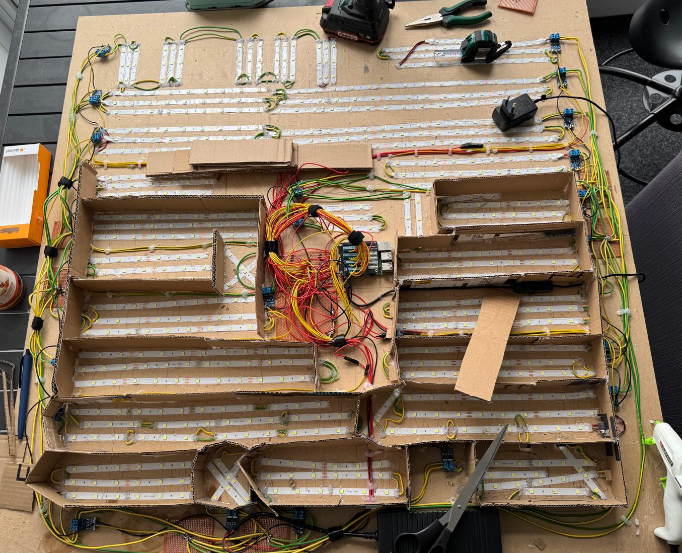 Um die Lesbarkeit der Uhr – vor allem tagsüber – deutlich zu verbessern, haben wir das Beleuchtungskonzept komplett überarbeitet. Statt einer einzelnen LED pro Buchstabe leuchten jetzt jeweils neun oder mehr LEDs. Insgesamt stecken nun über 22 Meter LED-Stripes in der Uhr. Zusätzlich haben wir auf doppelt so helle LEDs gesetzt und die Trennwände zwischen den Segmenten dicker gestaltet. So bleibt das Licht da, wo es hingehört – und die Worte sind klar und deutlich erkennbar, ohne dass andere Buchstaben mit leuchten.