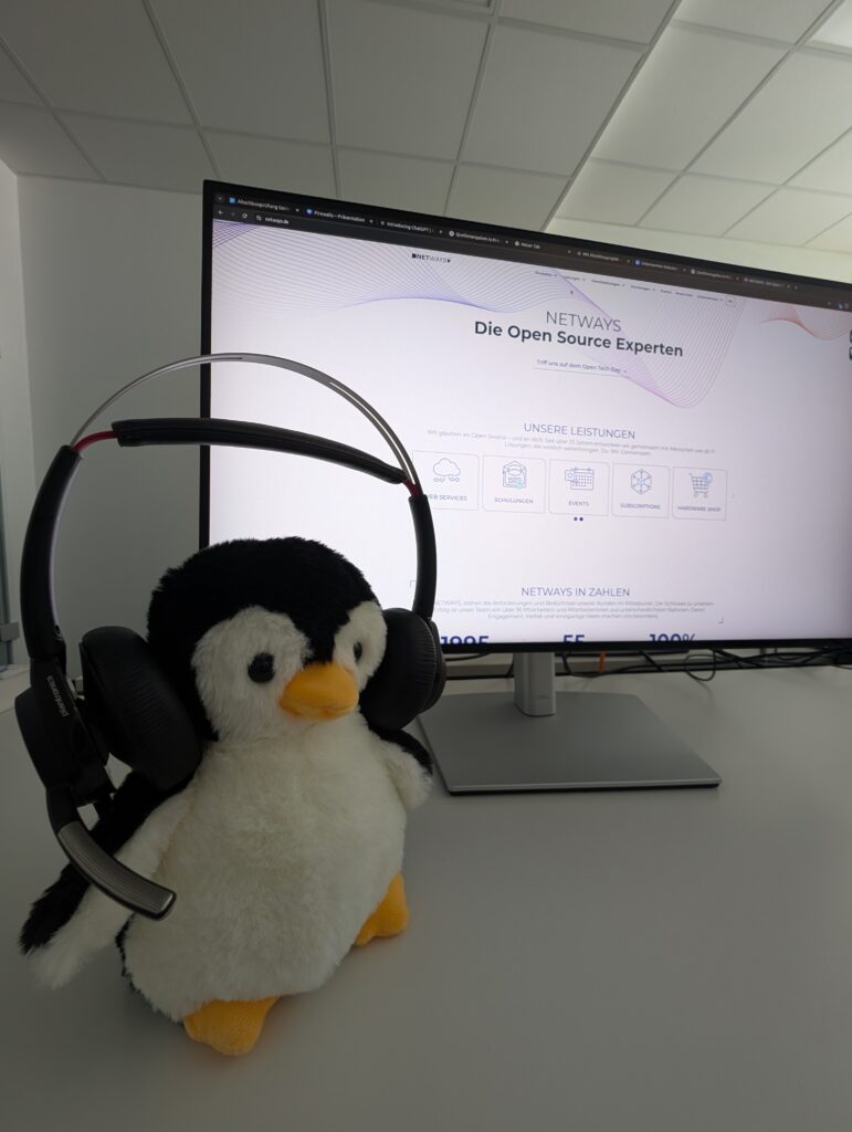 Im 1. Jahr bei NETWAYS habe ich zum Wichteln einen Stoffpinguin geschenkt bekommen – ich habe ihn Ping getauft, er passt immer auf, dass mein Headset voll geladen ist, bevor ich in das nächste Meeting gehe.