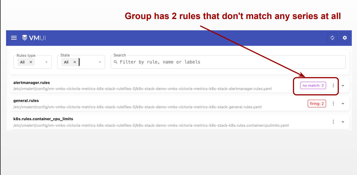 VictoriaMetrics lists all alert rules and flags any rule that isn’t matching data series. A separate “meta-alert” can be created to notify when a rule is broken: